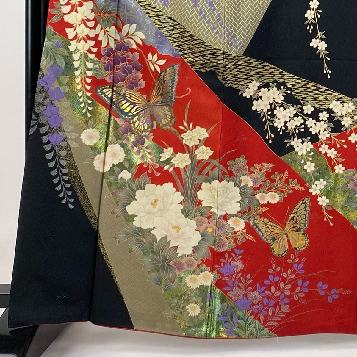 振袖 身丈164cm 裄丈65cm M 袷 森英恵 落款 蝶 草花 金銀彩 銀通し 黒 正絹の検索結果