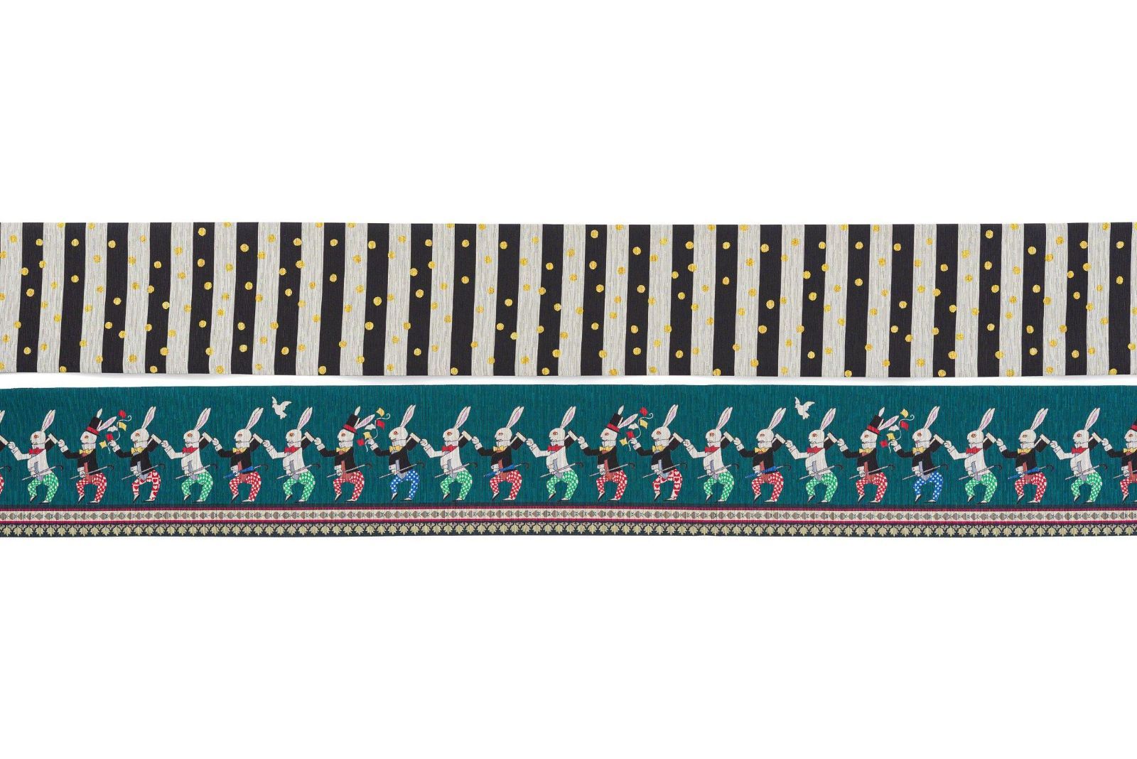 白うさぎが列をなしてダンスする、何とも楽しいデザインのリバーシブル半幅帯です。