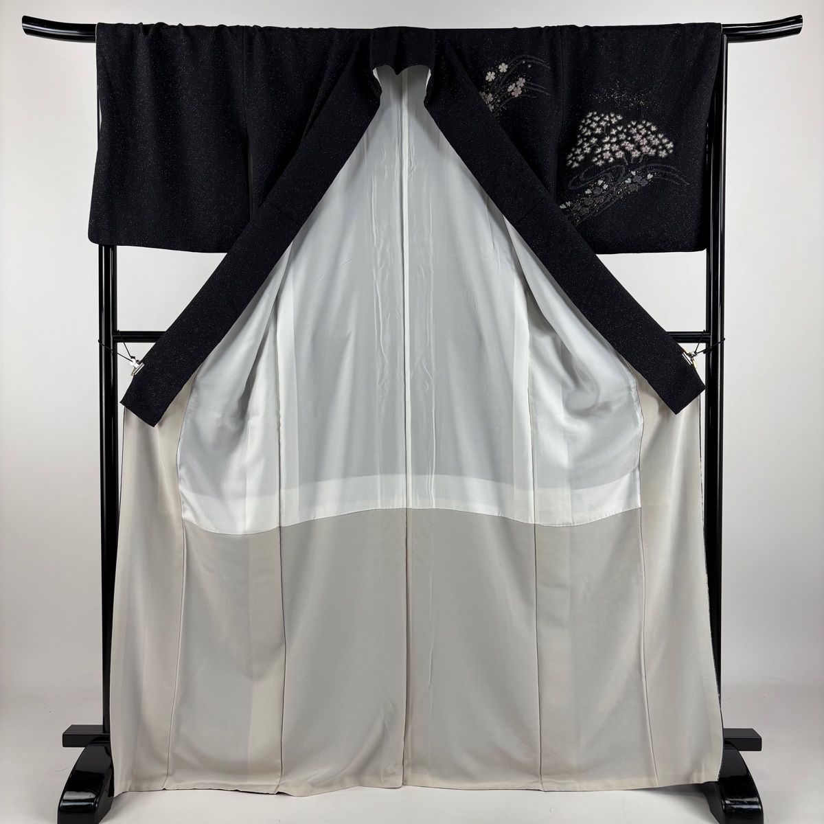 付下げ 身丈169.5cm 裄丈68cm L 袷 吉乃一廉 落款 枝梅 枝垂れ桜 銀通し 絞り 墨色 正絹の検索結果