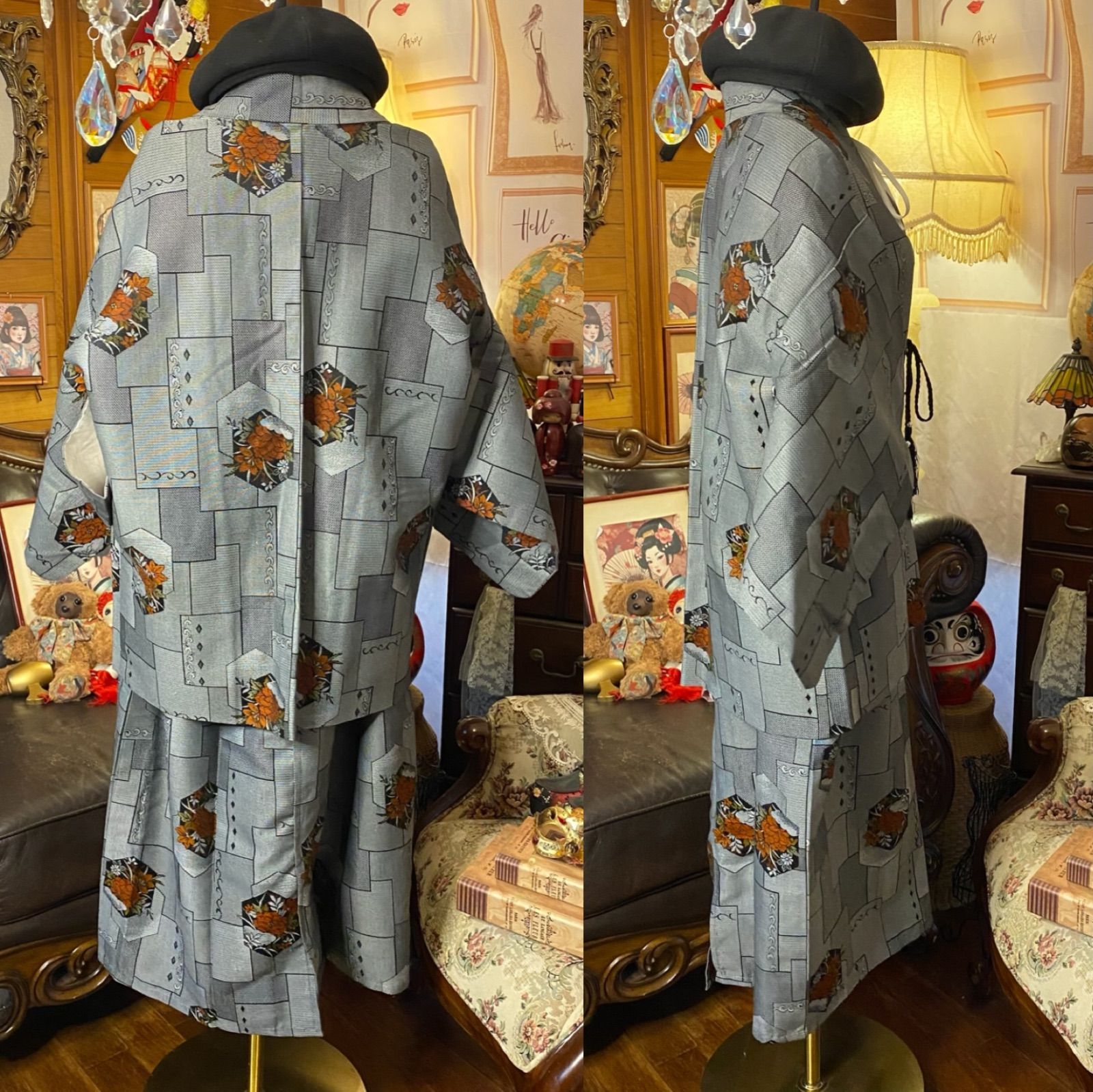 着物リメイクロングワンピース アンサンブル 帯サッシュベルト付き 和洋折衷 ハンドメイド レトロ 古着 煙鼠グレーの幾何取り×六角花文 aKW-89の検索結果