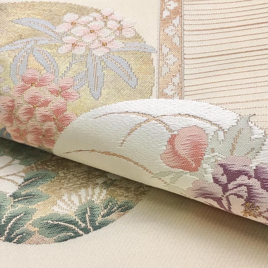 名古屋帯 丸に花模様 薄卵色 金糸 O-5654 WWW_GLOBALQUALITYIMPORTS_COM