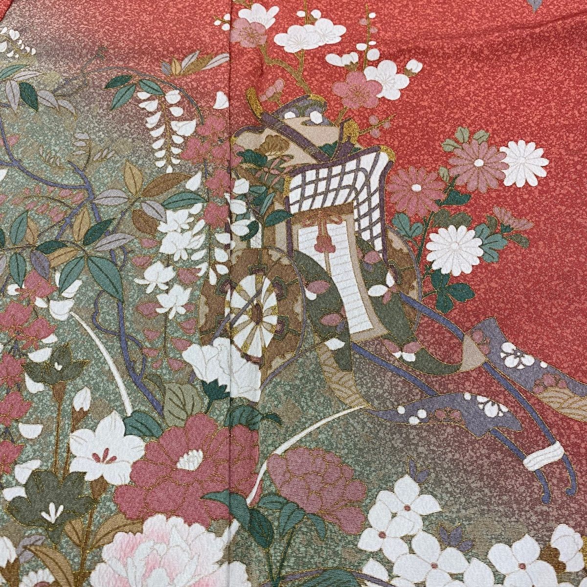 訪問着 身丈152.5cm 裄丈62.5cm S 袷 御所車 草花 金彩 ぼかし 朱色 正絹 秀品の検索結果