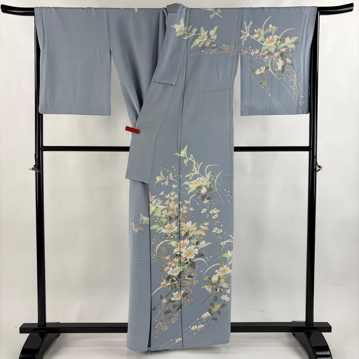 訪問着 身丈158cm 裄丈67.5cm L 袷 岡崎雄夷 加賀友禅 落款 証紙 草花 青灰色 正絹 一つ紋 WWW_GLOBALQUALITYIMPORTS_COM
