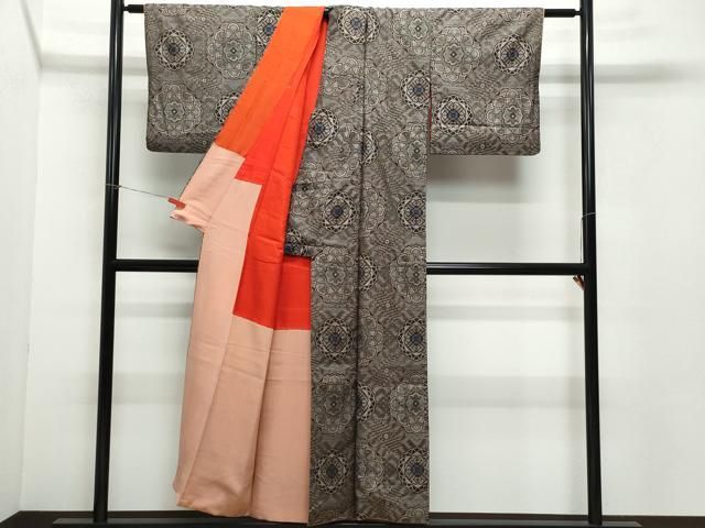 本場大島紬 着物 袷 正絹 更紗紋 グレー 藤絹織物謹製 kimonolove 新古品 オゾン消臭サービス A-1629