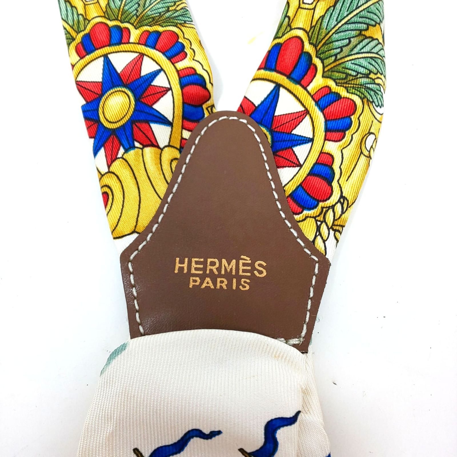 977A-03 HERMES エルメス シルク サスペンダー レザー 総柄 ホワイト系 ゴールド金具 ブランド 服飾雑貨 WWW_GLOBALQUALITYIMPORTS_COM