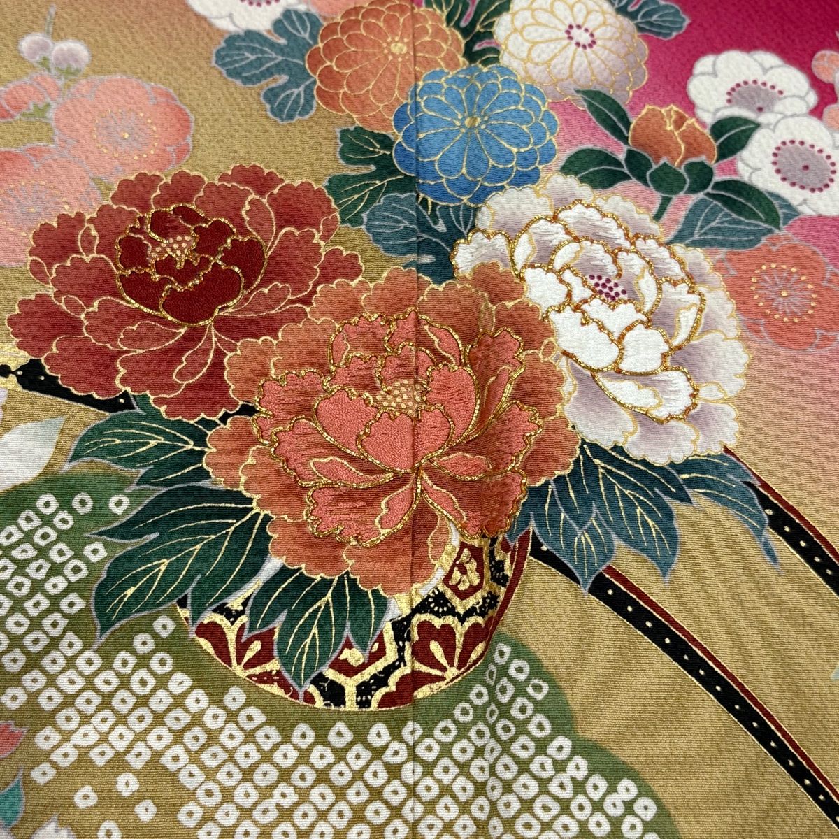 振袖 身丈179.5cm 裄丈70cm 未仕立て 仮絵羽 御所車 草花 金糸 金彩 ピンク 正絹 秀品