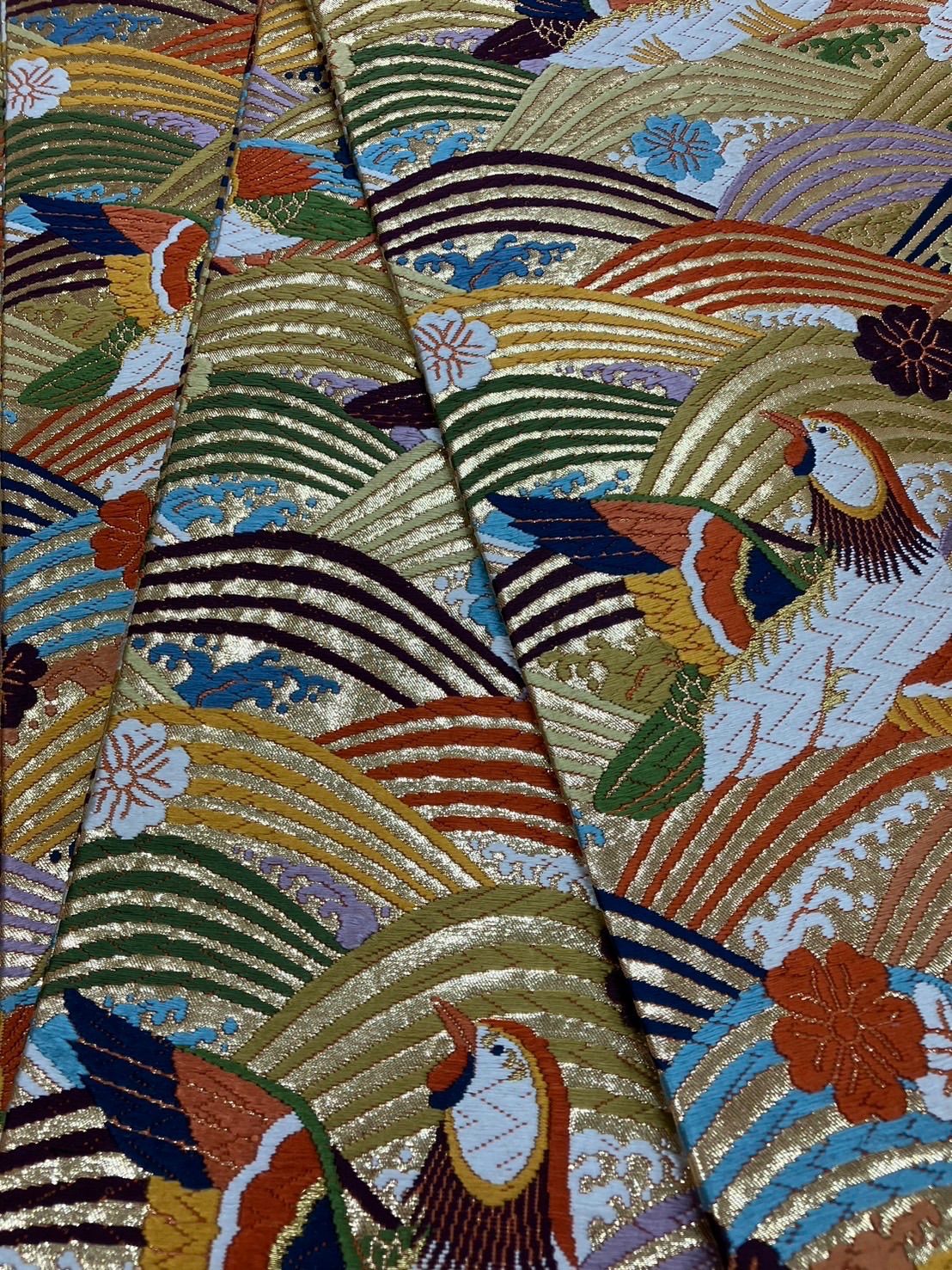 るんるん 振袖用全通丸帯 OB-101 鳥 波 青海波 花 金 カラフル WWW_GLOBALQUALITYIMPORTS_COM