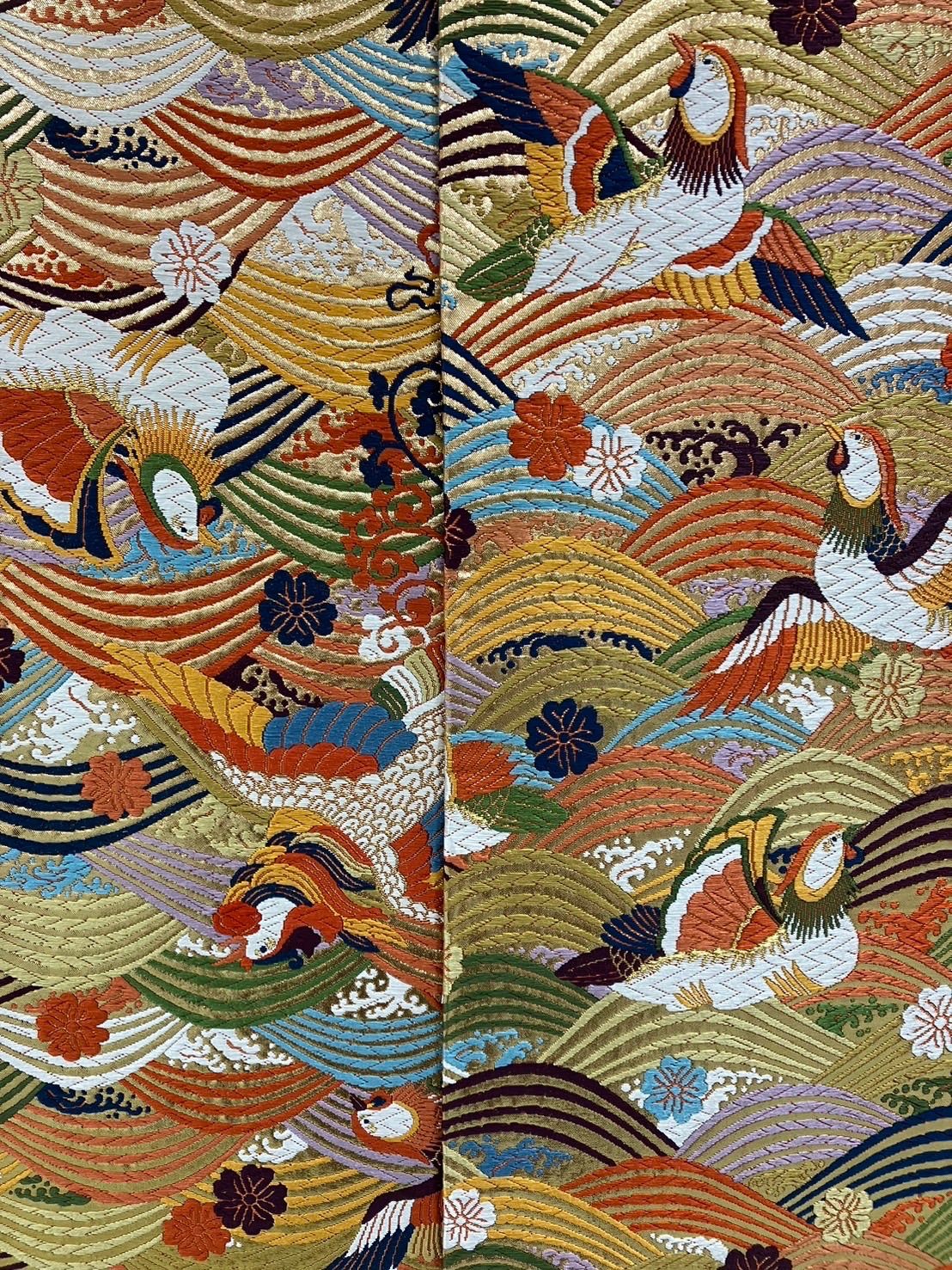 柄はカラフルな…青丹色、紺色、端色、緋色、山吹色、黄土色などで波が華やかに刺繍されていて中に鳥と花が飛んでいます。