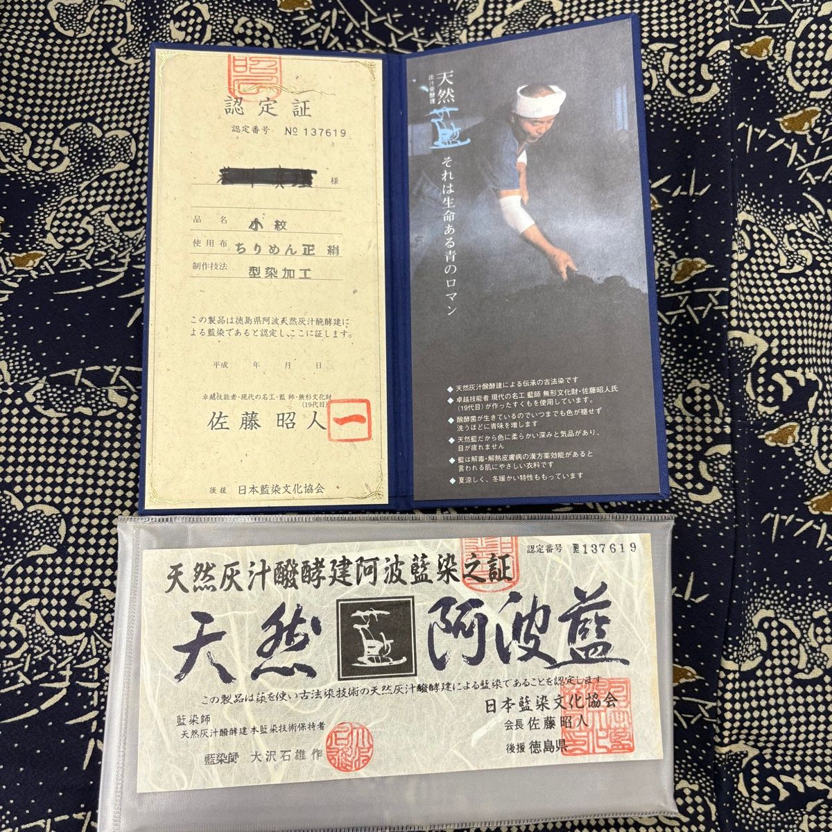 小紋 身丈157cm 裄丈66.5cm M 袷 佐藤昭人 落款 証紙 千鳥 波頭 藍染 藍色 正絹 WWW_GLOBALQUALITYIMPORTS_COM