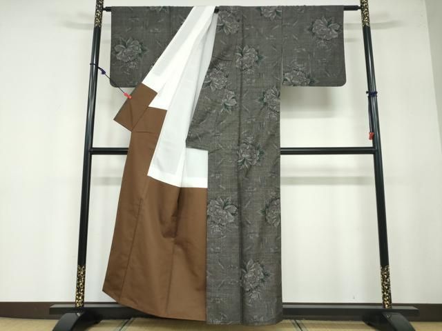 紬 身丈155cm 裄丈64.5cm M 袷 格子 幾何学 花織 灰色 正絹