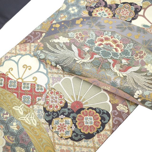 金銀糸をふんだんに使用し、向かい鳥・菊・華文・花唐草・宝尽くし などが美しく織り上げられています。
