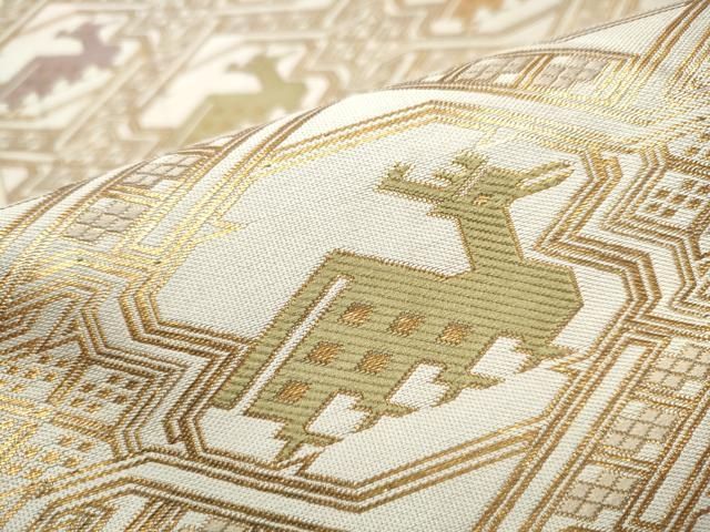 袋帯 龍村平蔵 落款 宮嶋格子錦 幾何学 金糸 箔 クリーム お太鼓柄 正絹