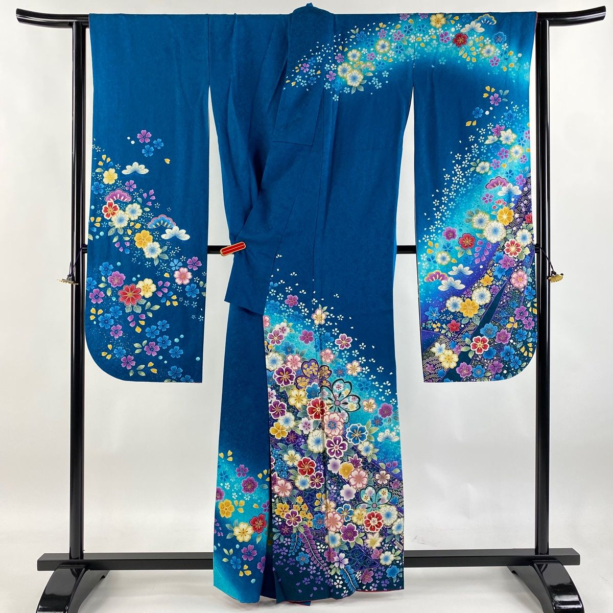 振袖 身丈159cm 裄丈69.5cm L 袷 手鞠 牡丹 金彩 ぼかし 濃紺 正絹 秀品