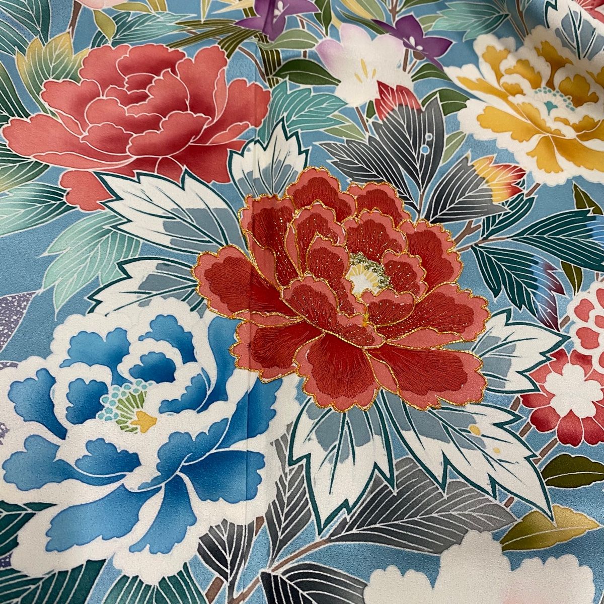 振袖 身丈164.5cm 裄丈64.5cm M 袷 鴛鴦 牡丹 刺繍 金糸 水色 正絹の検索結果