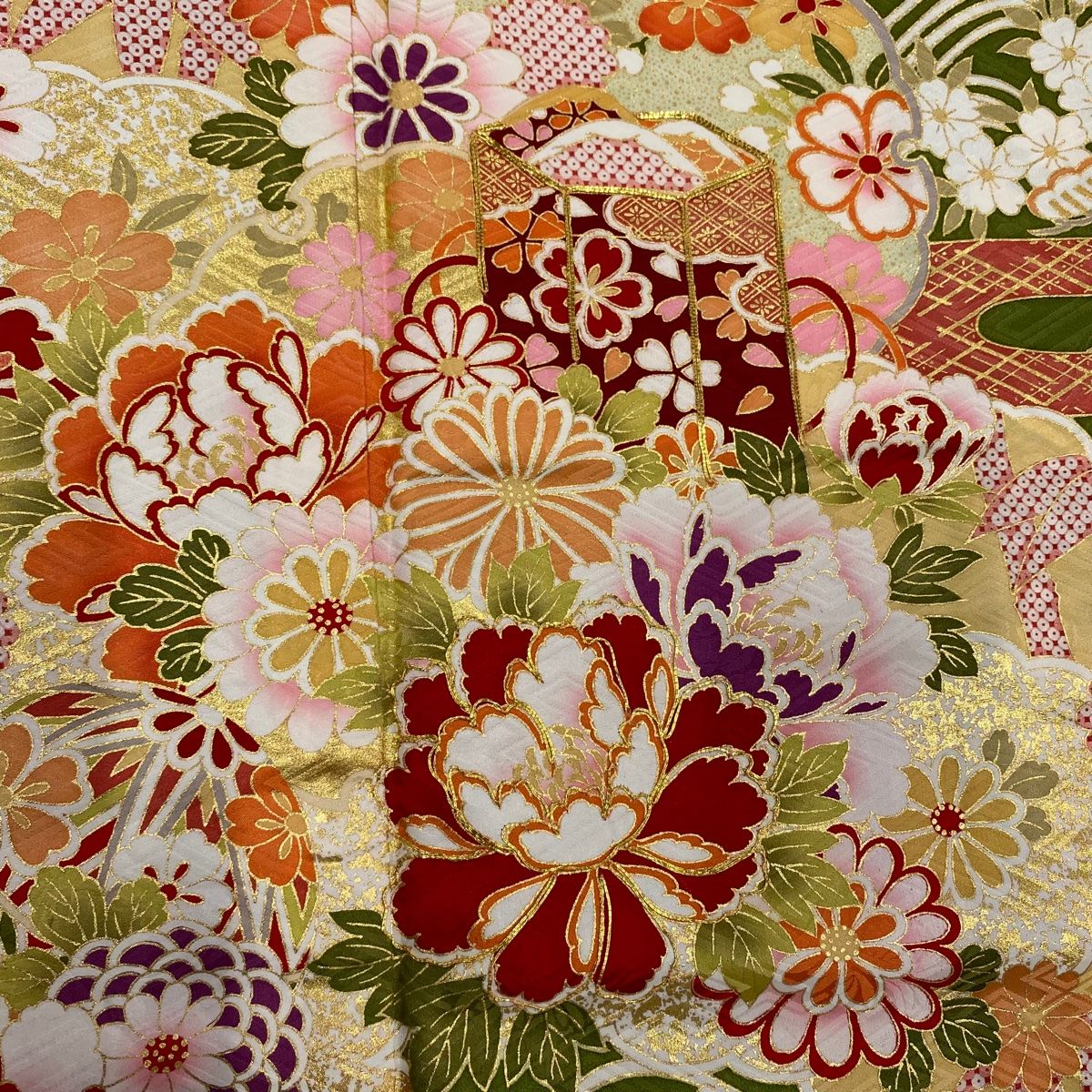 振袖 身丈161.5cm 裄丈66.5cm M 袷 手毬 桜 箔 金彩 クリーム 正絹 秀品