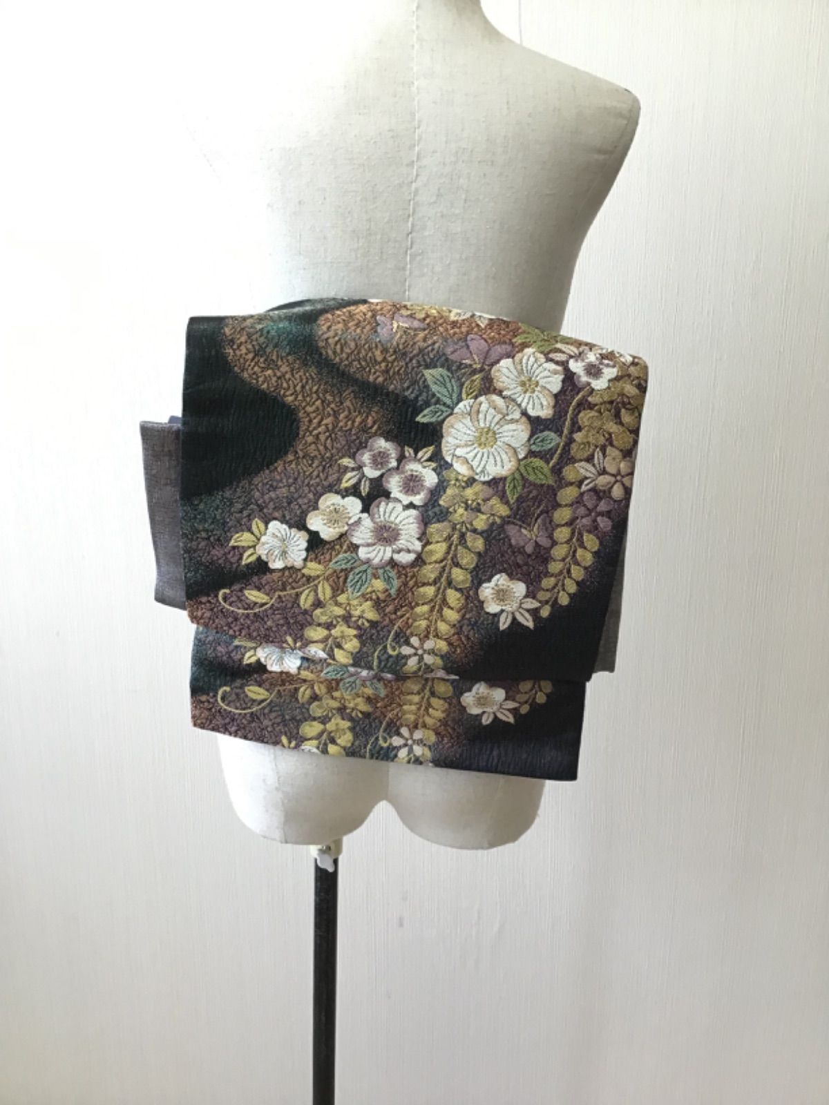 桜と藤が辻が花風に表現された、可愛らしい印象の帯です。