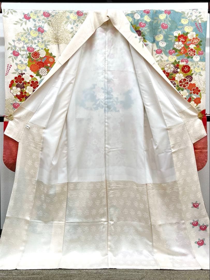 振袖 身丈166.5cm 裄丈66cm M 袷 牡丹 桜 銀通し 箔 灰白 正絹