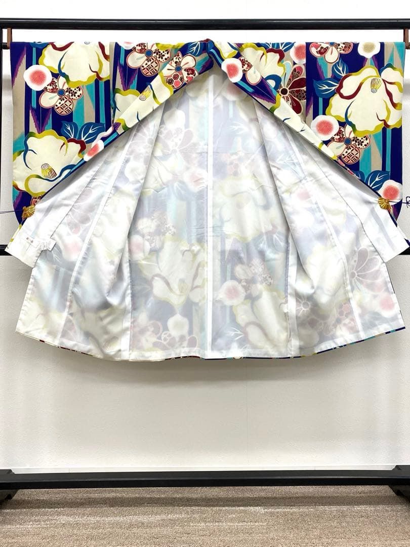 振袖 身丈165cm 裄丈67cm M 袷 草花 鳥 染め分け 藍色 正絹