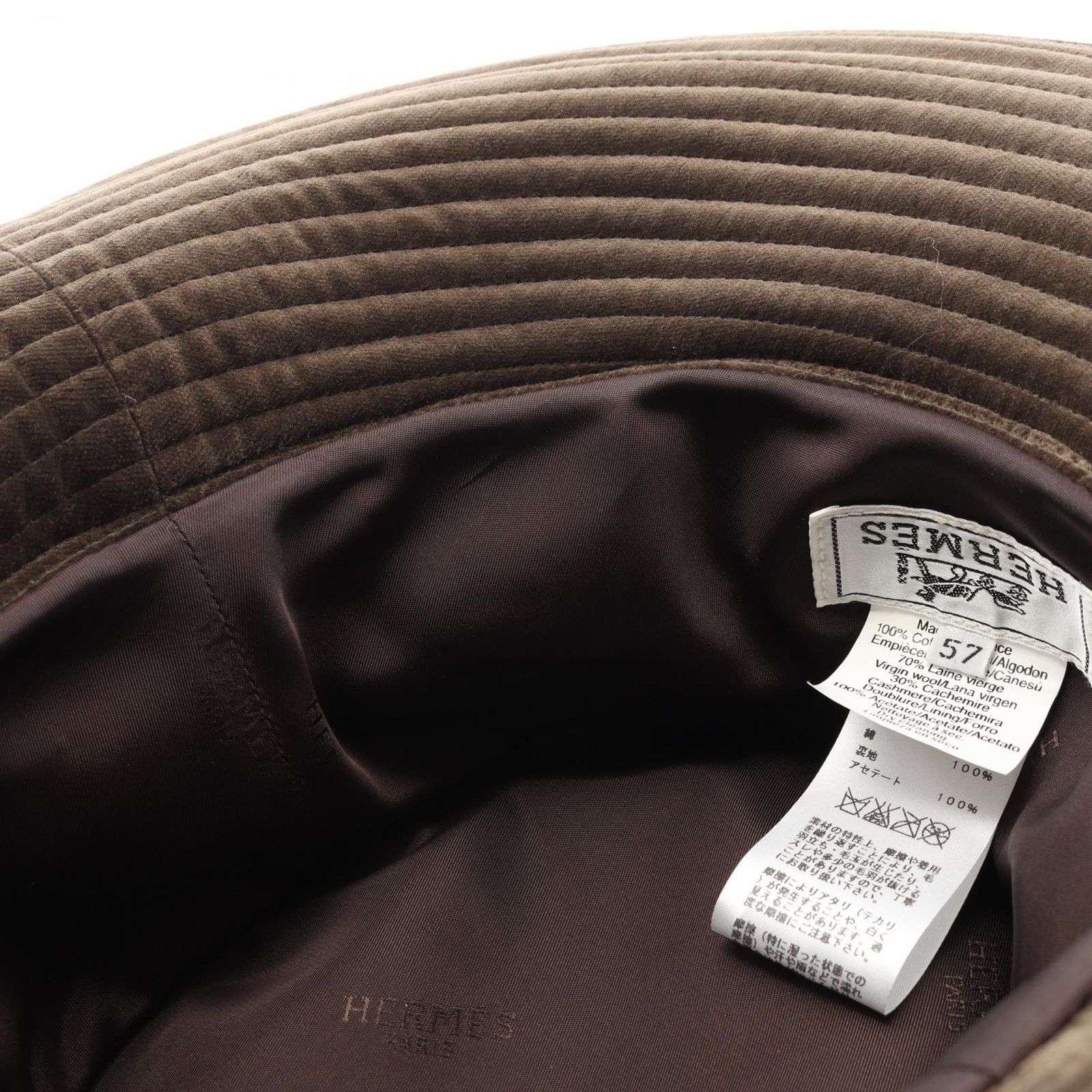 HERMES エルメス ウール カシミヤ混 裏地ロゴ総柄 ベロア切替 帽子 ハット グレー カーキ 57 フランス製 レディース