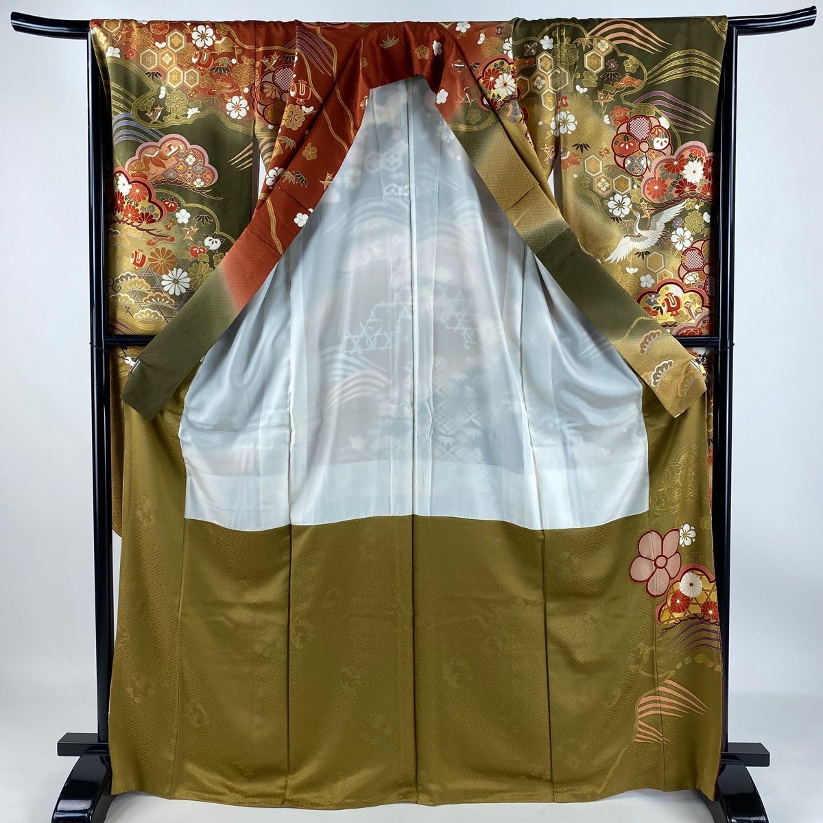 振袖 身丈169cm 裄丈66cm M 袷 松竹梅 鶴 金糸 金彩 茶緑色 正絹 秀品の検索結果