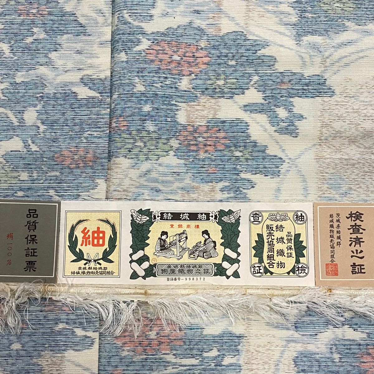 結城紬 身丈168cm 裄丈67cm M 袷 100亀甲 本場結城紬 奥順 ますいわ屋 証紙あり 麻の葉 草花 濃紺 正絹