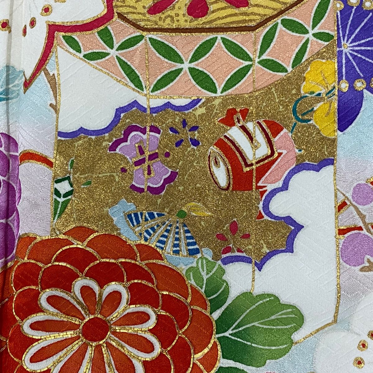 振袖 身丈165cm 裄丈66.5cm M 袷 菊 七宝 総絞り クリーム 正絹