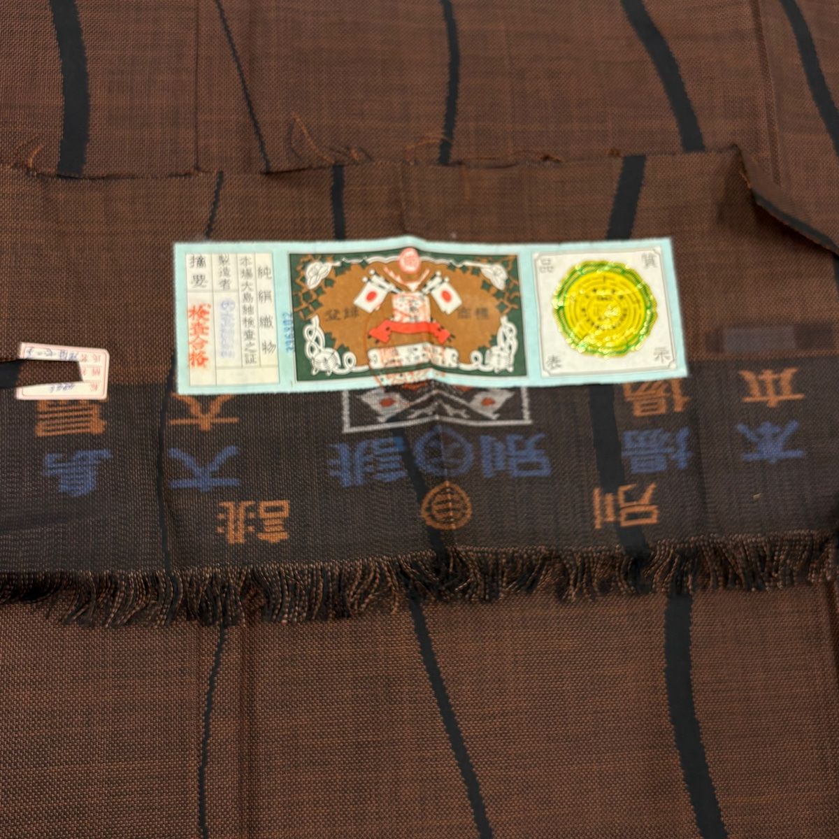 大島紬 身丈155.5cm 裄丈62.5cm S 袷 証紙 よろけ縞 茶色 正絹 秀品の検索結果