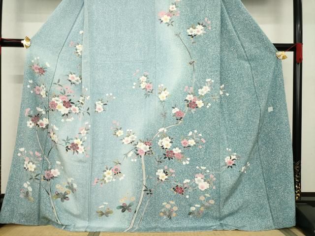 訪問着 身丈160.5cm 裄丈64cm M 単衣 華文 草花 刺繍 金糸 灰緑 正絹