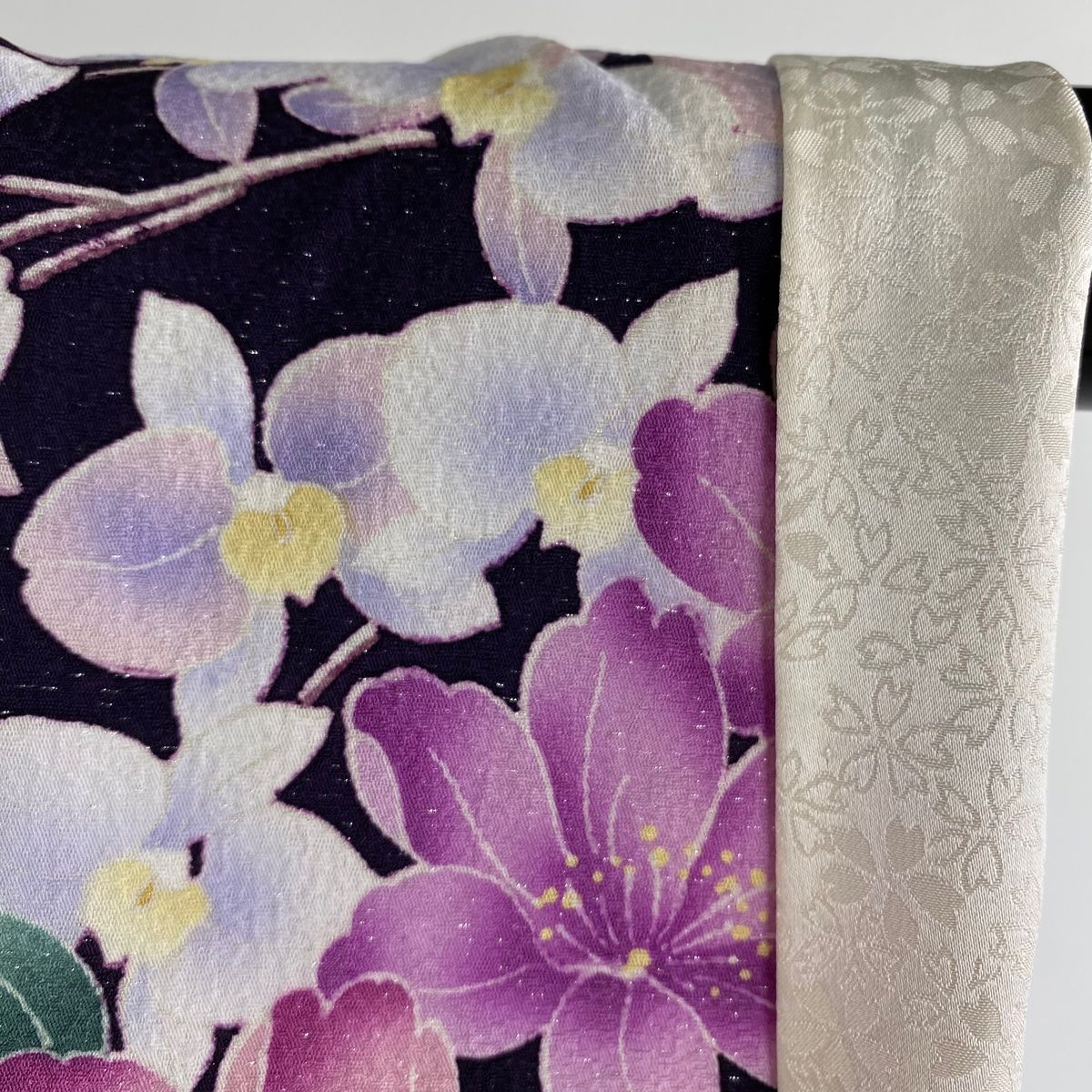 振袖 身丈167cm 裄丈67cm M 袷 袋帯フルセット 桜 胡蝶蘭 銀通し 金糸 濃紫 正絹の検索結果