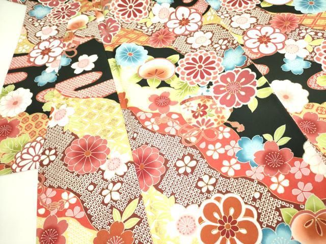 平和屋着物 小振袖 二尺袖 道長花鞠文 橘 黒地 金彩 DAAX1965opの検索結果