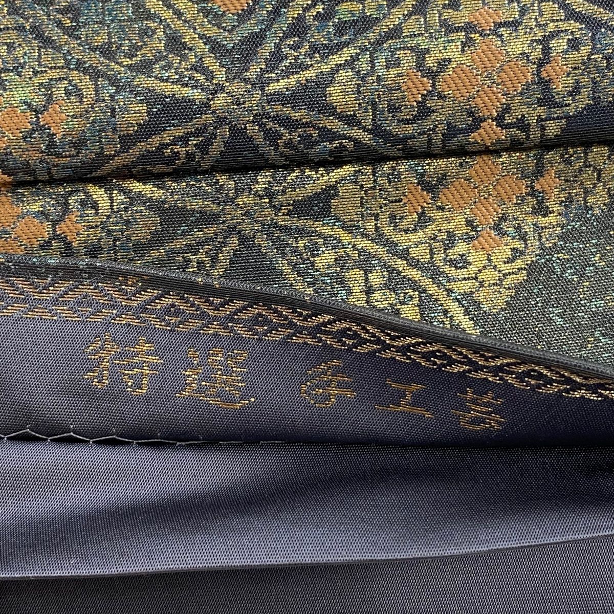 袋帯 秀品 服部織物 落款 華文 七宝 金糸 箔 灰色 六通 正絹の検索結果