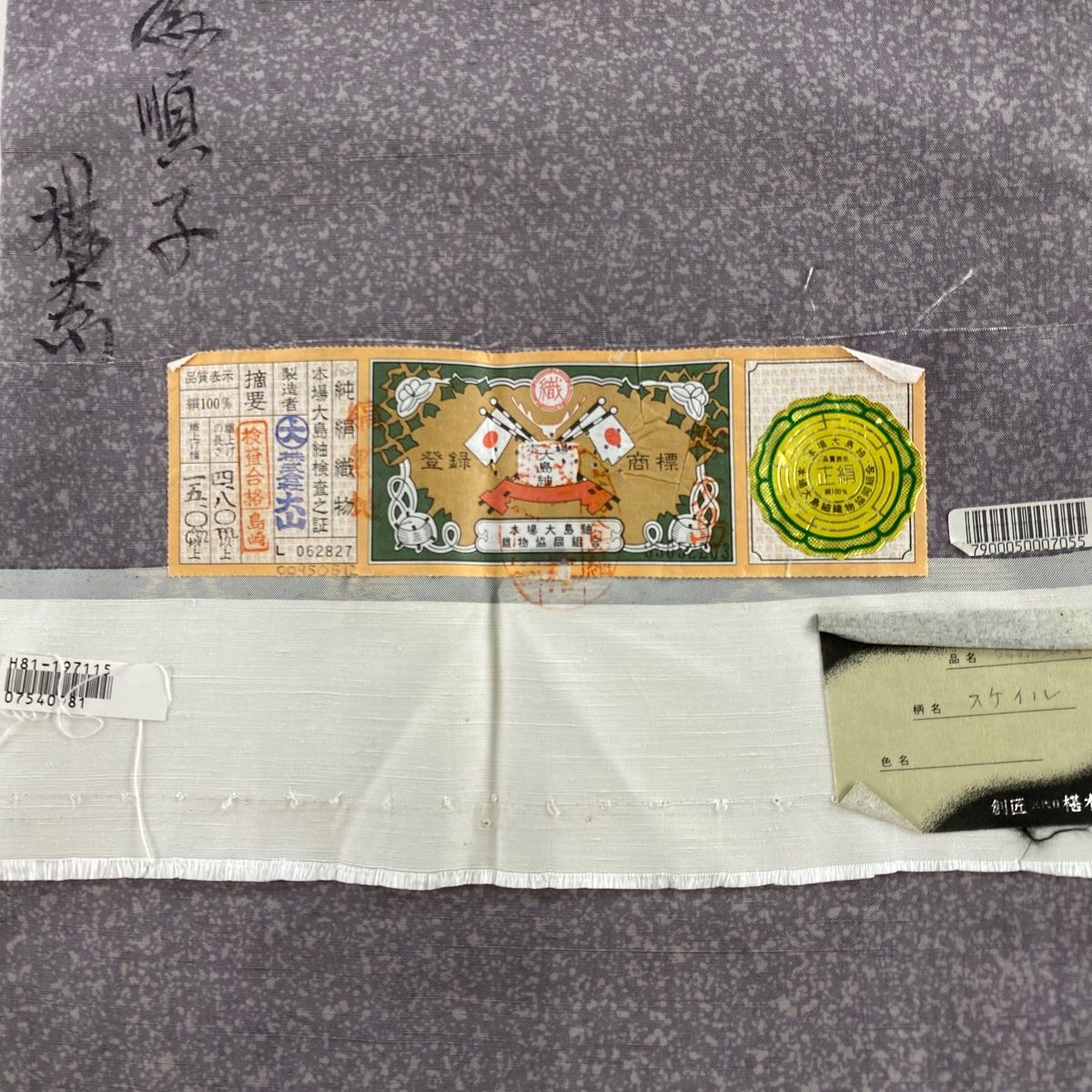 開き名古屋帯 秀品 落款 証紙 大島紬地 鱗 灰紫 正絹 WWW_GLOBALQUALITYIMPORTS_COM