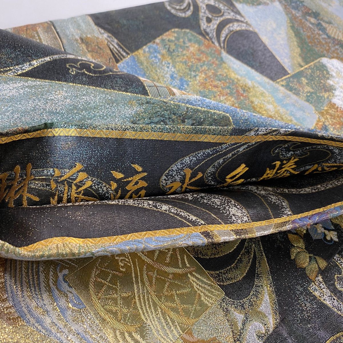 丸帯 琳派流水名勝図 花鳥 風景 金銀糸 箔 墨色 お太鼓柄 正絹 WWW_GLOBALQUALITYIMPORTS_COM