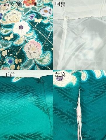 振袖 身丈164.5cm 裄丈68cm L 袷 桜 疋田 金糸 染め分け 青緑 正絹