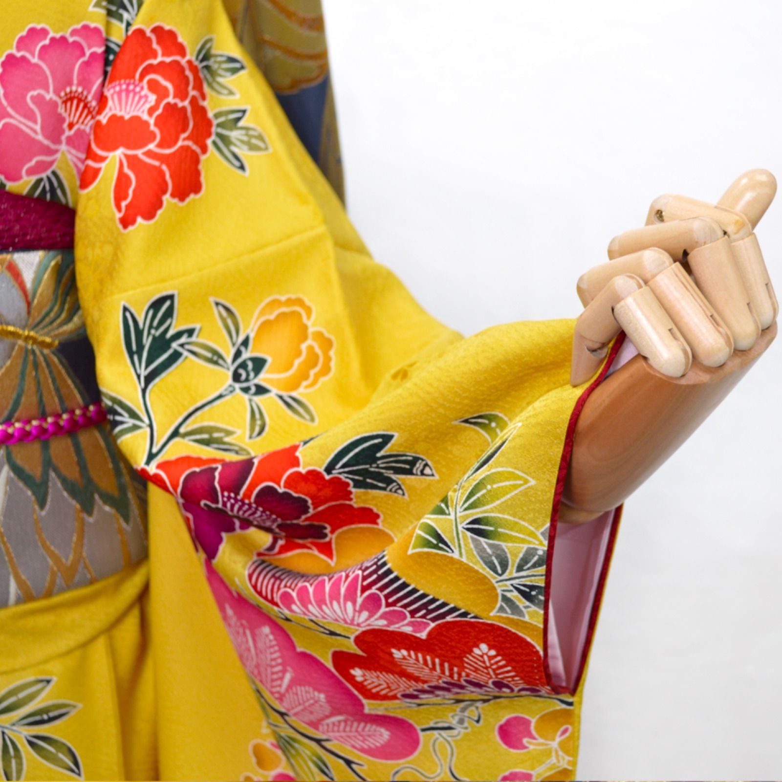 正絹 振袖フルセット S〜Mサイズ 紅型 成人式 山吹色 パールトーン加工済み 長襦袢付き お仕立て済み イエロー パープル グリーン 個性的 伝統 古典 着物 豪華 結納 卒業式 振袖セット F228 WWW_GLOBALQUALITYIMPORTS_COM