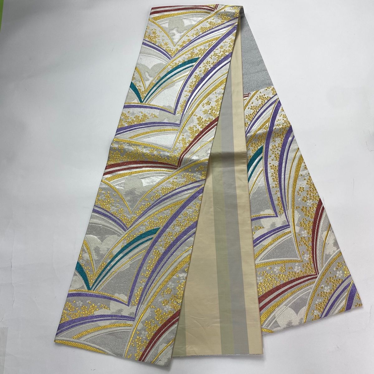 袋帯 秀品 扇面 桜 箔 刺繍 赤茶 六通 正絹