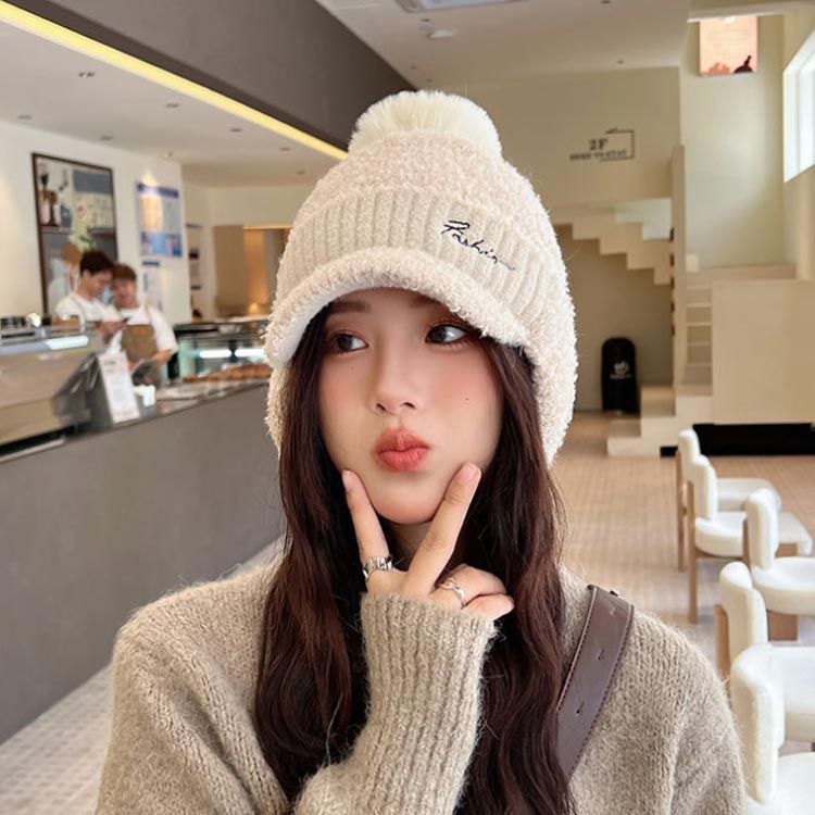 耳当て付きニット帽 レディース 帽子 ニット帽 裏起毛 ボンボン つば付き 厚手 暖かい ゴルフ スポーツ カジュアル 耳当て ポンポン付き 配色 おしゃれ あったかグッズ プレゼント 通勤 pdd9284