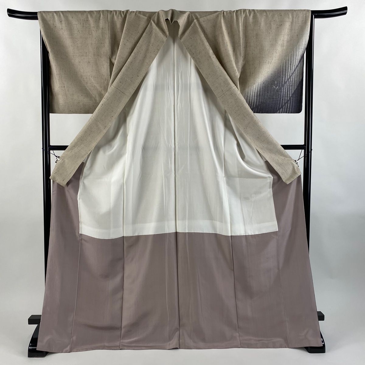 付下げ 身丈173cm 裄丈67cm M 袷 奥越後 魚沼ぜんまい紬 袋帯セット 縦縞 葉柄 薄茶色 正絹の検索結果