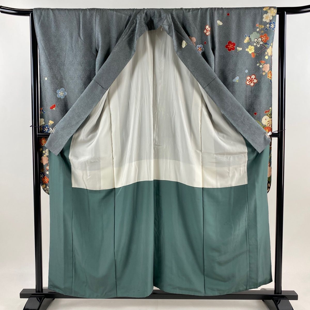 振袖 身丈158.5cm 裄丈65.5cm M 袷 花車 草花 金糸 金彩 灰緑 正絹 秀品の検索結果