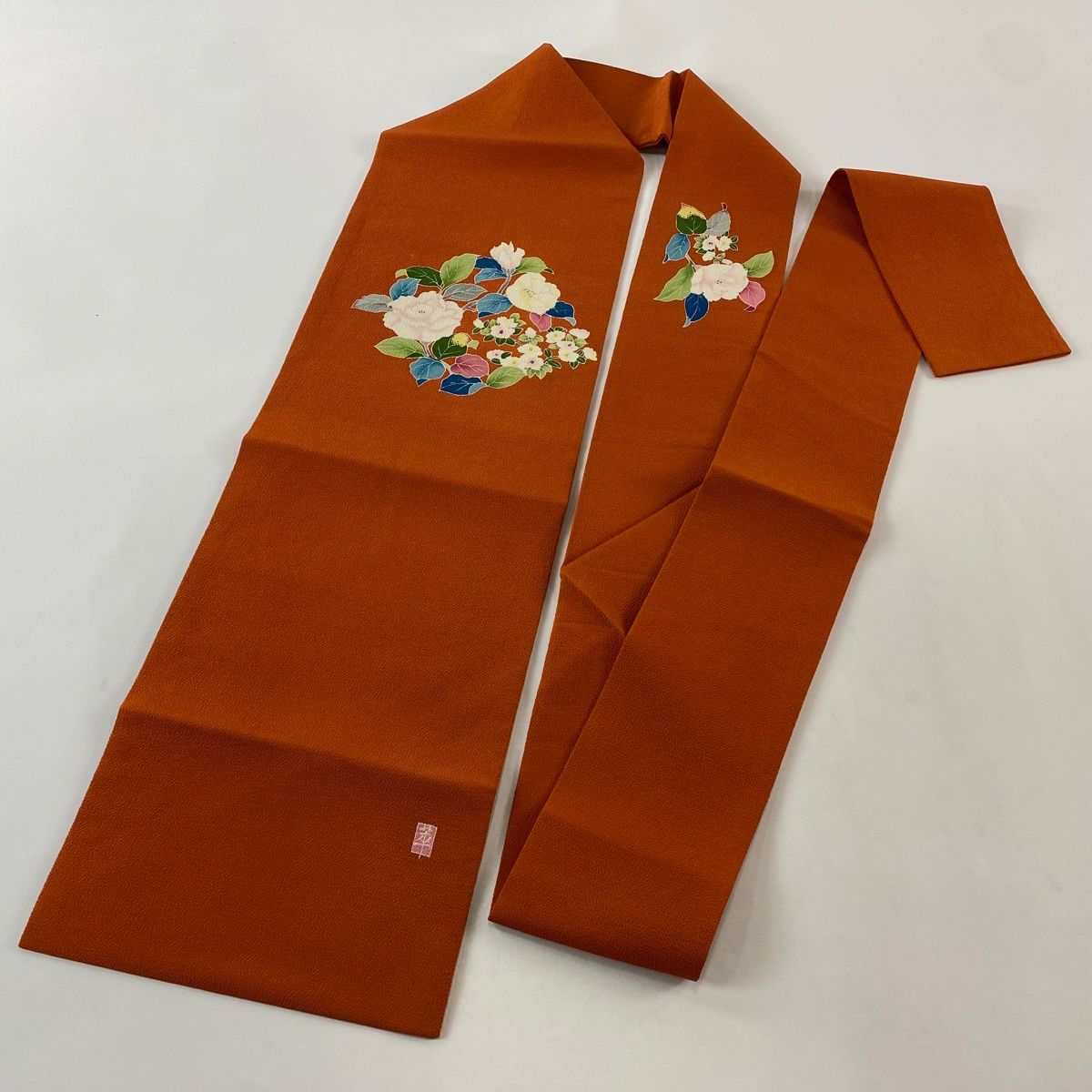 名古屋帯 秀品 落款 椿 枝花 縮緬 オレンジ 正絹 WWW_GLOBALQUALITYIMPORTS_COM