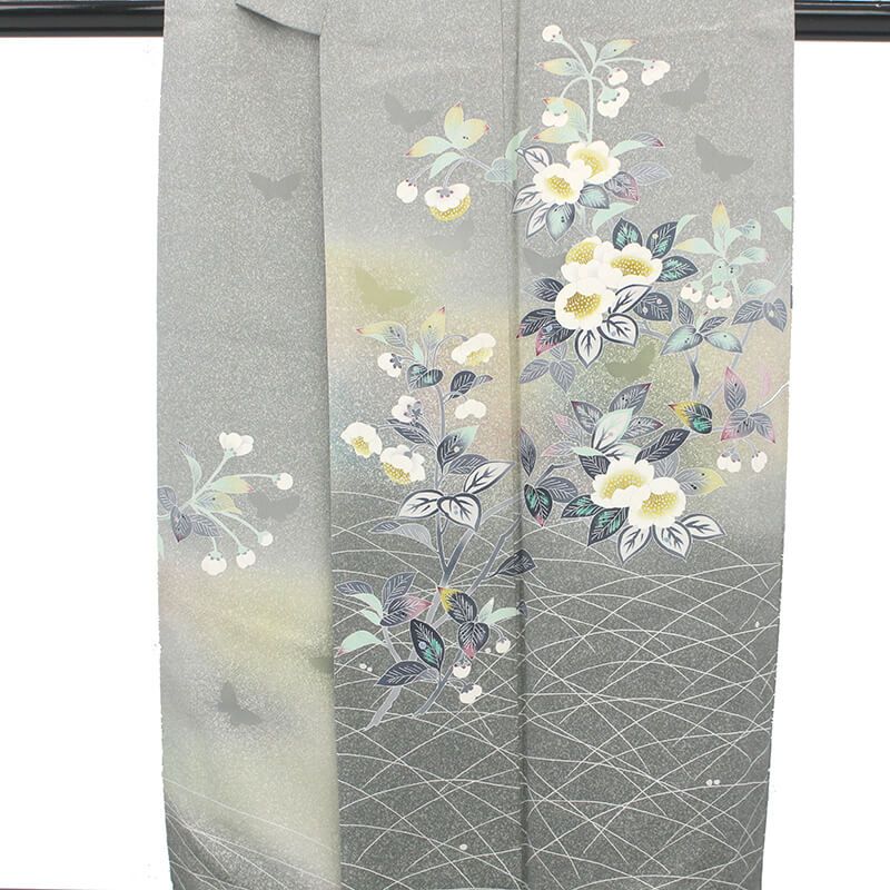 人間国宝「羽田登喜男」氏の訪問着です。品格ある色使いが魅力です。灰水色のシックな色使いに、白のお花や灰色や薄緑などの枝葉、虫喰い技法を用いた繊細は柄使いが素敵です。蝶々などもさりげなく、表現されており、品格のあるスタイルとなっております。柔らかい色合いで、上品な着姿をお楽しみいただけます。