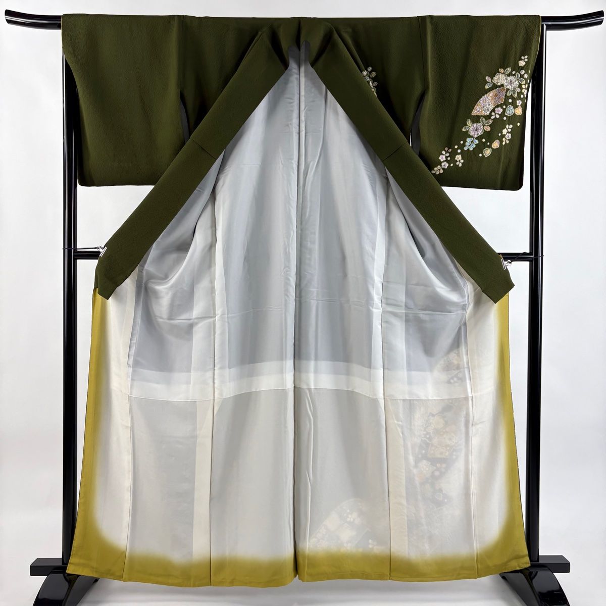 付下げ 身丈161.5cm 裄丈65cm M 袷 翠山工房 やまと 落款 辻が花 扇面 金彩 ぼかし 茶緑色 正絹 WWW_GLOBALQUALITYIMPORTS_COM
