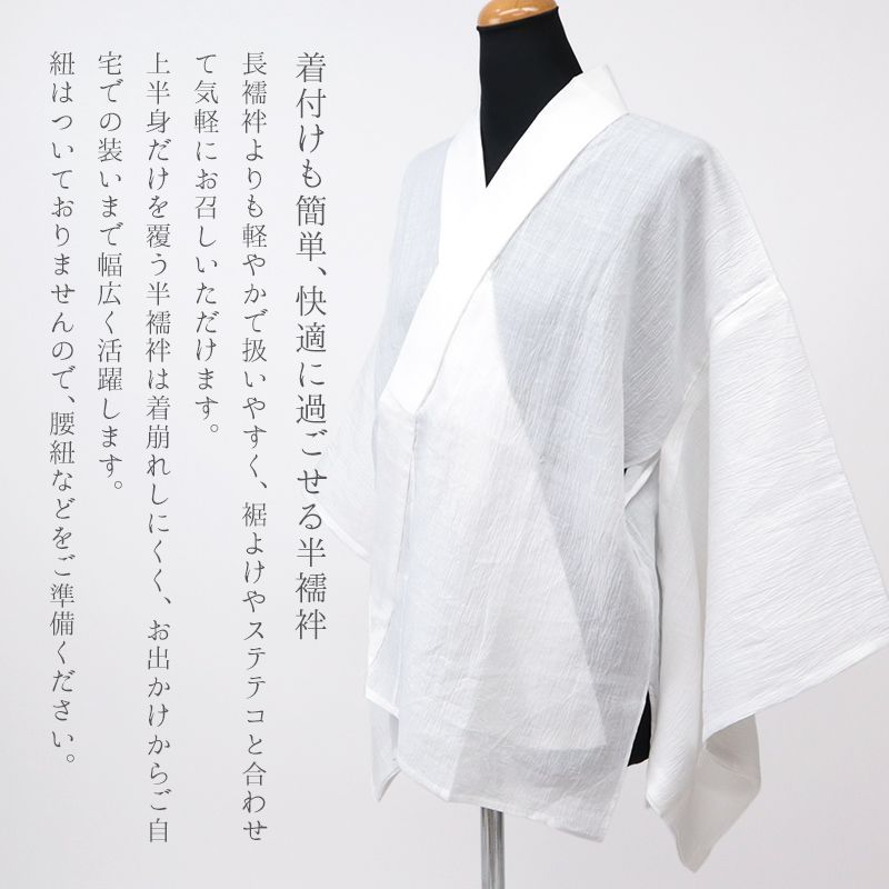 上半身だけを覆う半襦袢は着崩れしにくく、お出かけからご自宅での装いまで幅広く活躍します。