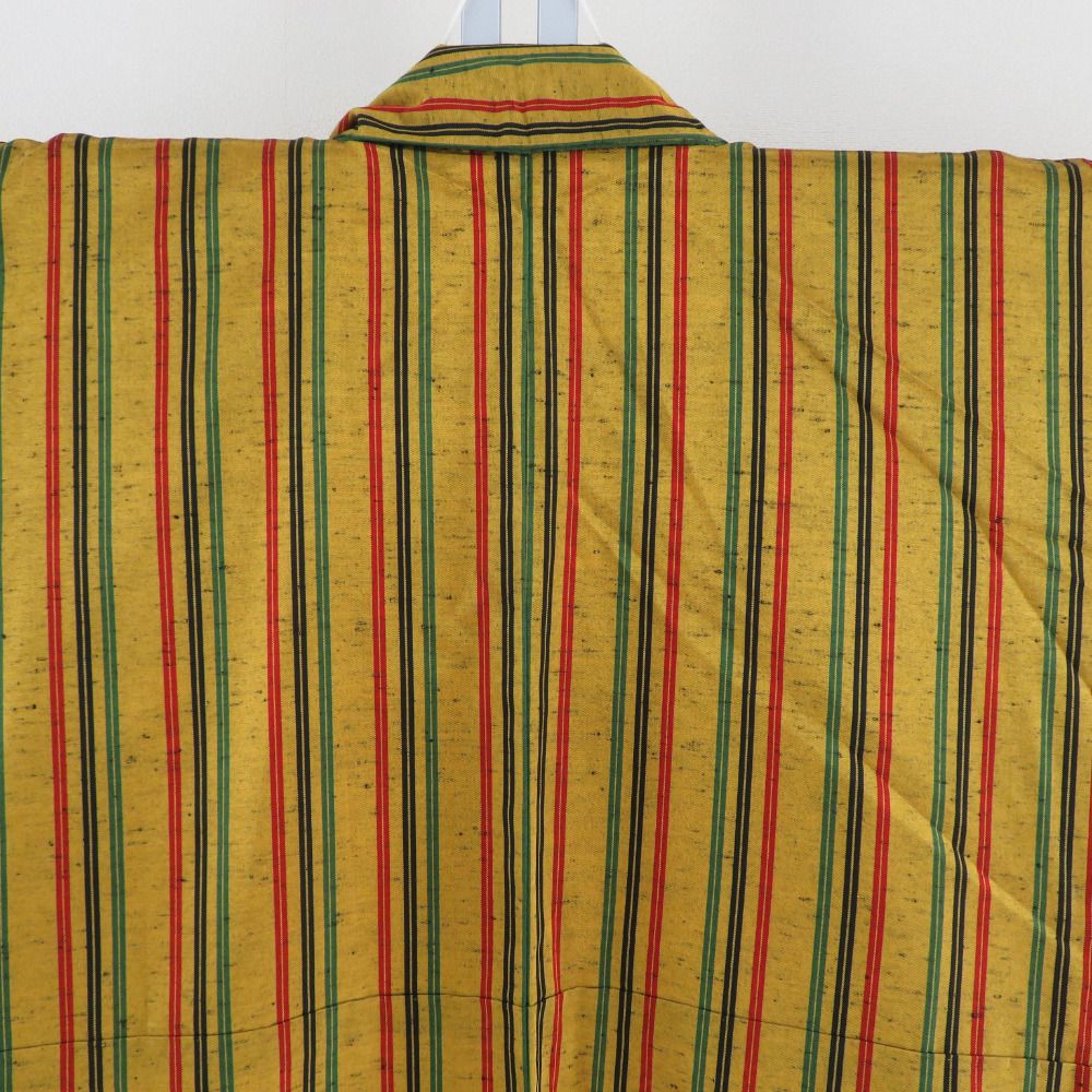 紬 着物 縦縞模様 辛子色x黒色x赤色x緑色 袷 広衿 絹 仕立て上がり着物 身丈164cmの検索結果