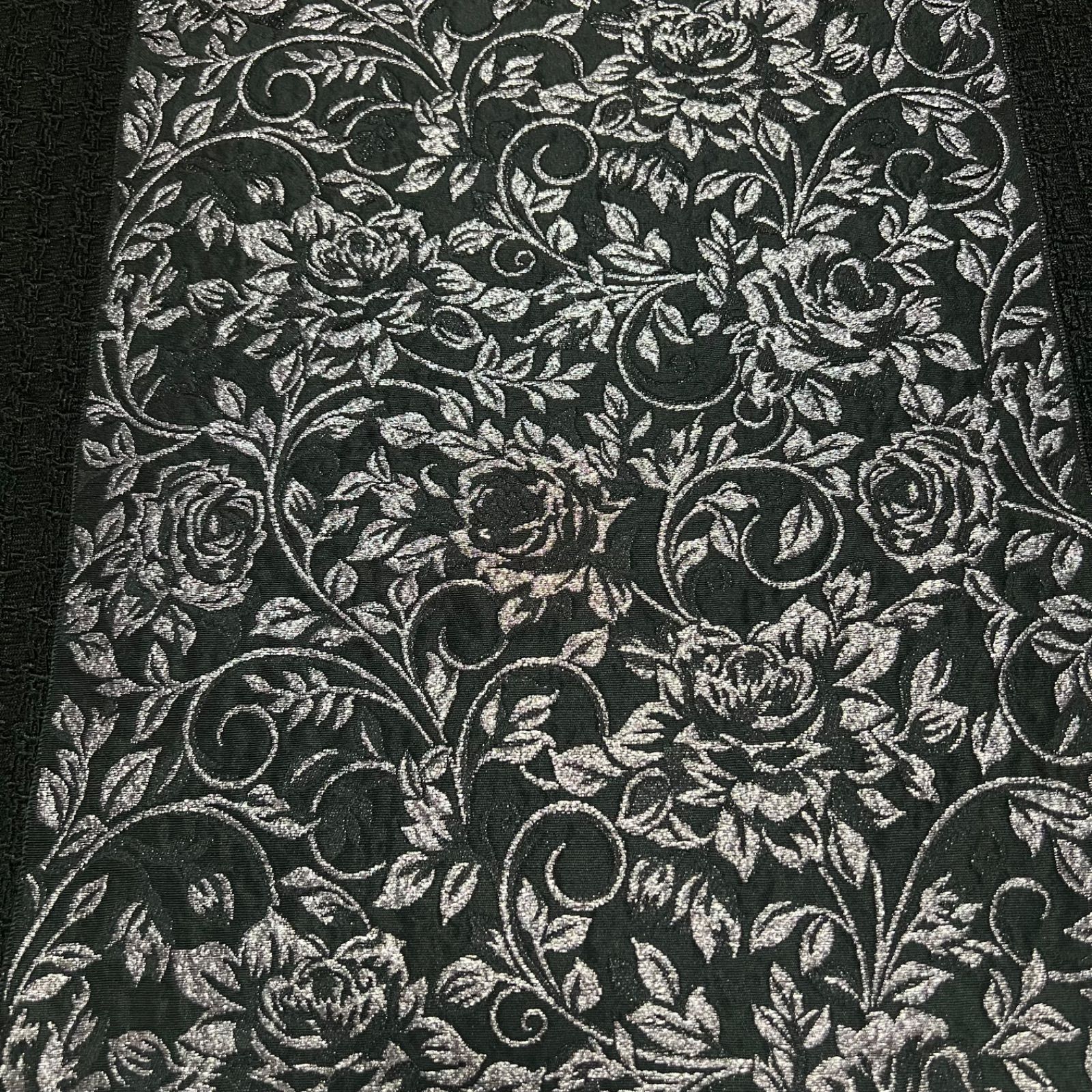 黒地に紫のラメ糸で花唐草が織られた、とても華やかな帯です。