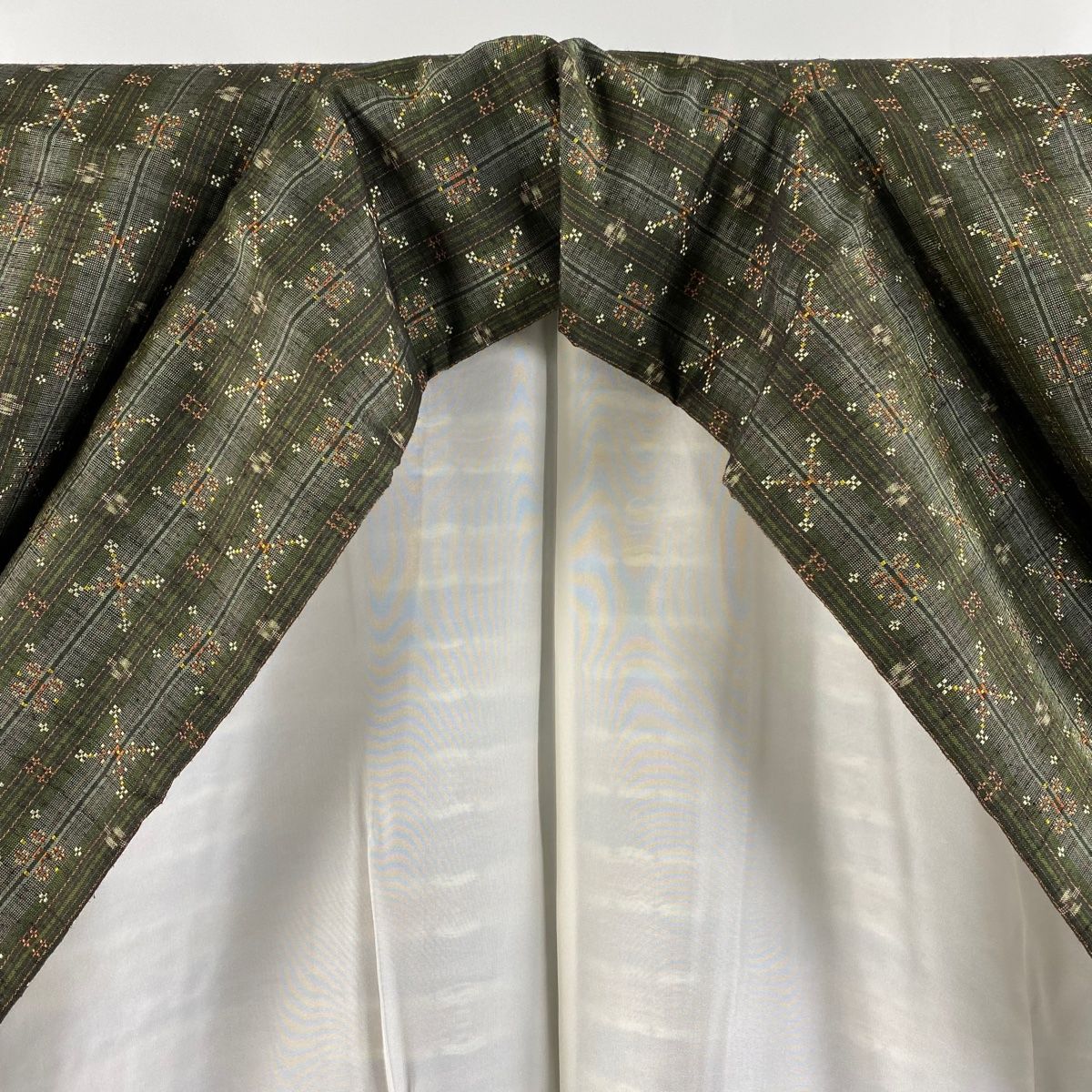 紬 身丈152cm 裄丈62cm S 袷 縦縞模様 幾何学模様 花織 深緑 正絹 WWW_GLOBALQUALITYIMPORTS_COM