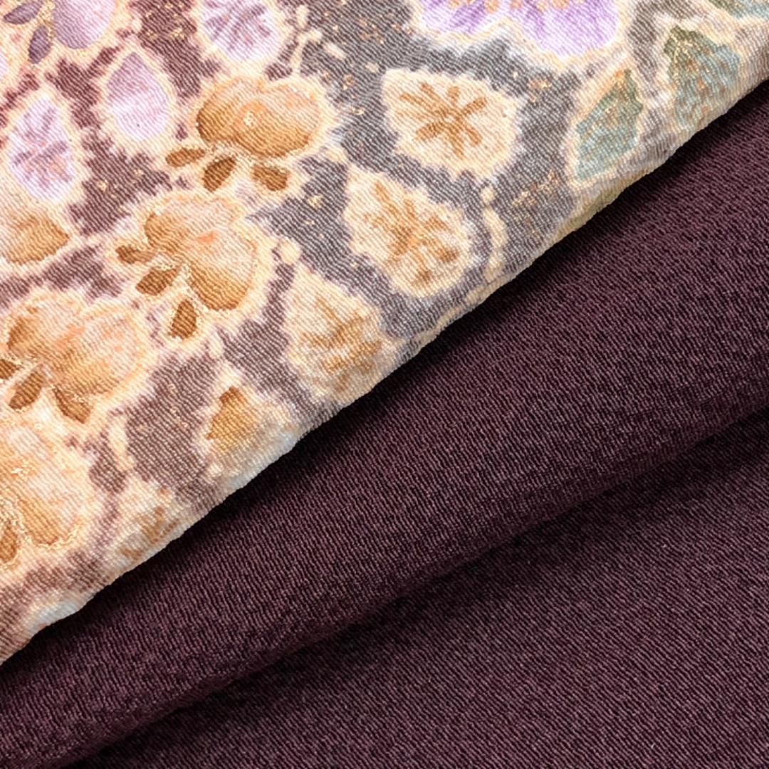 溜色のお色味に美しい辻が花絞りがデザインされた雰囲気の良い素敵なお品でございます。