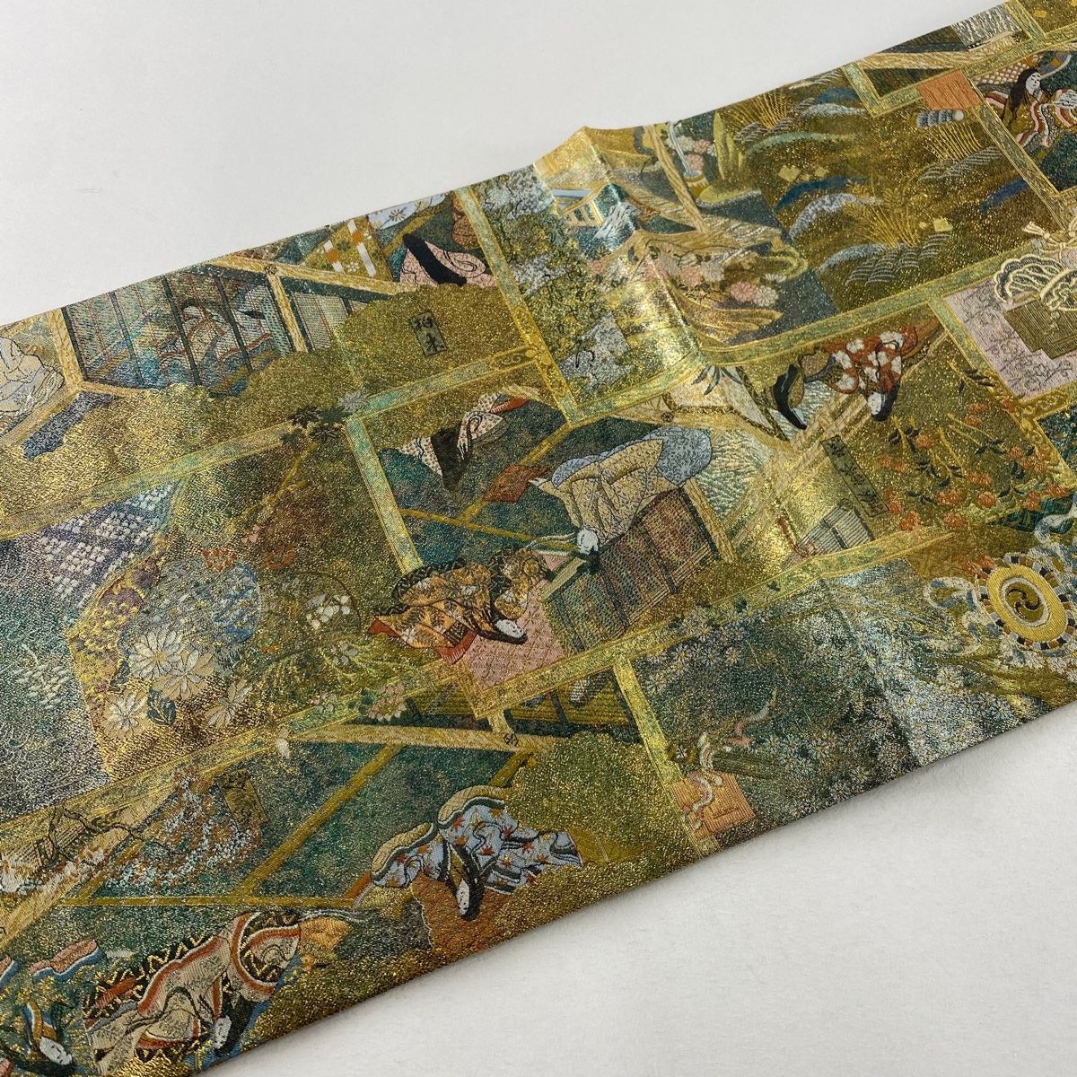 丸帯 落款 徳川美術館秘蔵 紫式部 源氏物語名鑑 人物 扇 箔 青緑 全通 正絹 WWW_GLOBALQUALITYIMPORTS_COM
