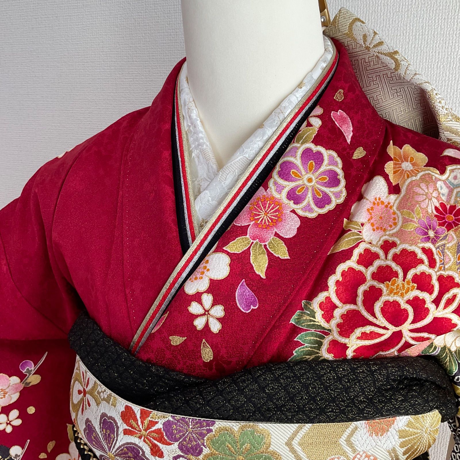 振袖・帯・重ね衿・帯揚げ・帯締め・長襦袢(半衿付き)の6点セットです。
