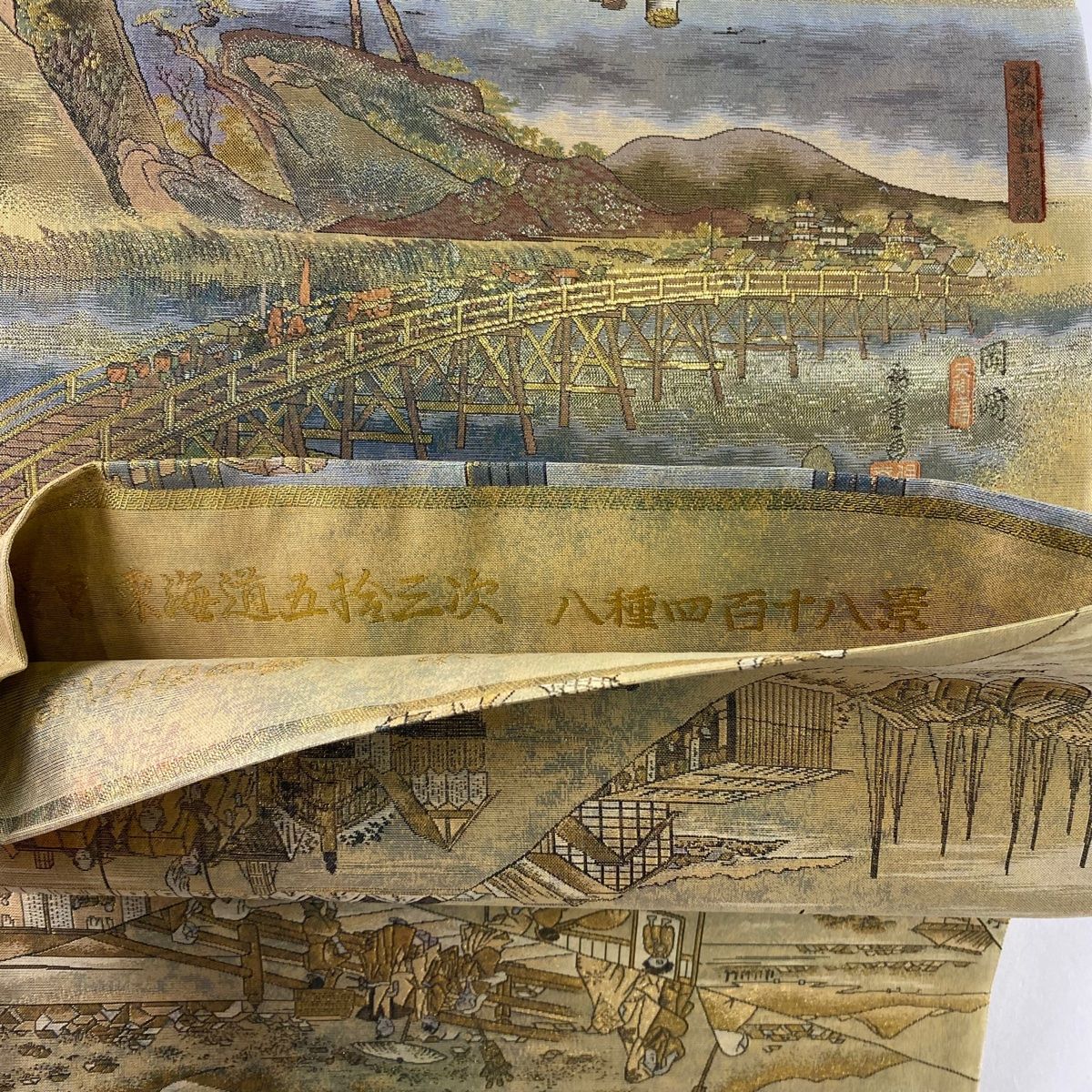 袋帯 秀品 廣重 風景 東海道五十三次 箔 黄土色 お太鼓柄 正絹 WWW_GLOBALQUALITYIMPORTS_COM